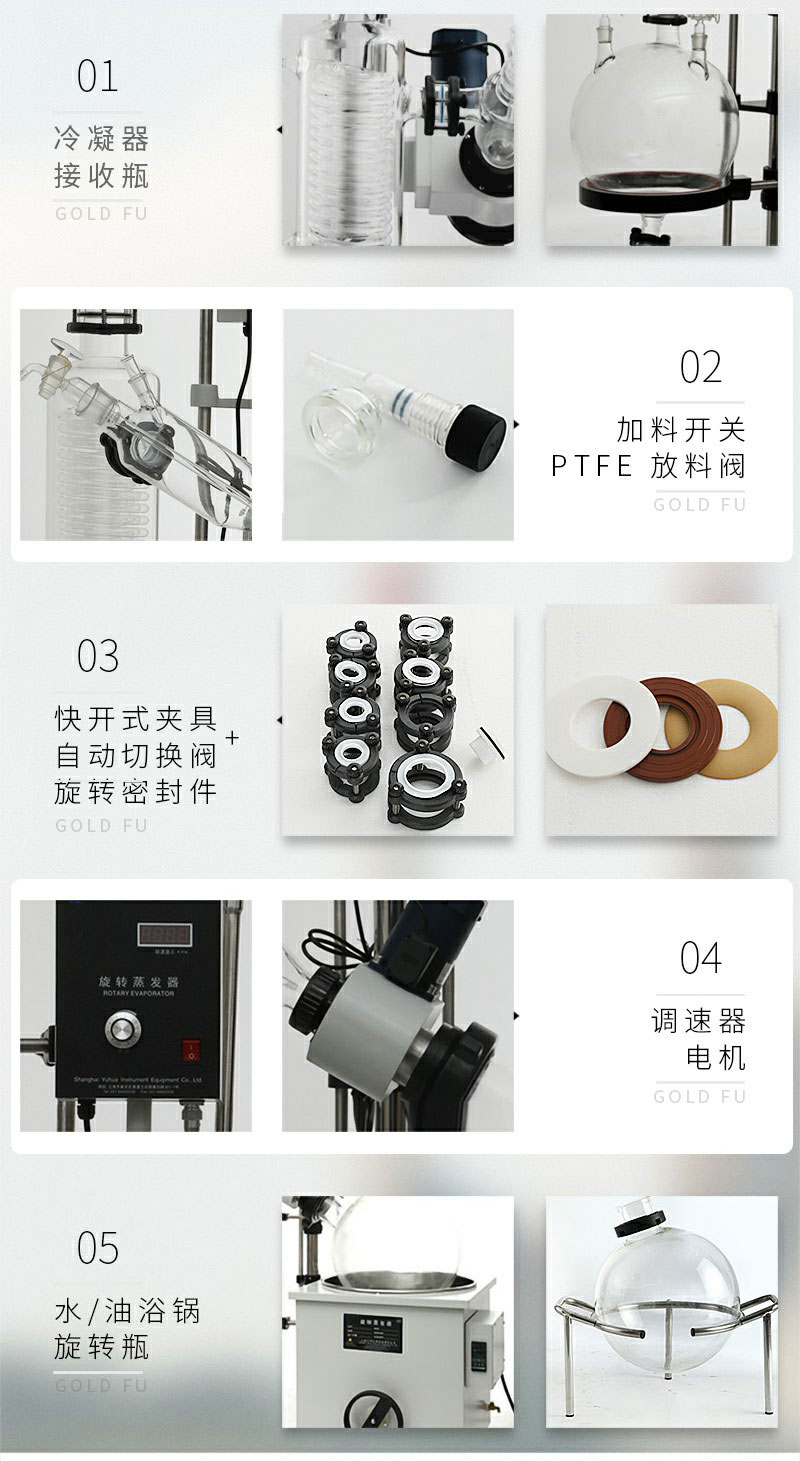 大型旋轉(zhuǎn)蒸發(fā)儀大容量、大口徑旋轉(zhuǎn)蒸發(fā)瓶,蒸發(fā)面積大,減壓置于水浴中,邊旋轉(zhuǎn)邊加熱,使溶液高效擴(kuò)散蒸發(fā),可用于生物、醫(yī) 藥、化工、食品等領(lǐng)域的小試、中式和生產(chǎn)。
